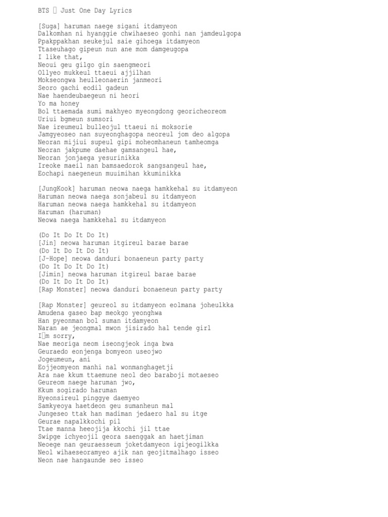 Lirik hangul yeah just one day one night, that's what i want 하루만 내게 시간이 있다면 달콤한 니 향기에 취해서 곤히 난 잠들고파 빡빡한 . Lirik lagu bts just one day + terjemahan. Skool luv affair hangul 하루만 . › just one day (하루만) ( 슈가 ) . Lyrics bts just one day rom+indo+eng translate.